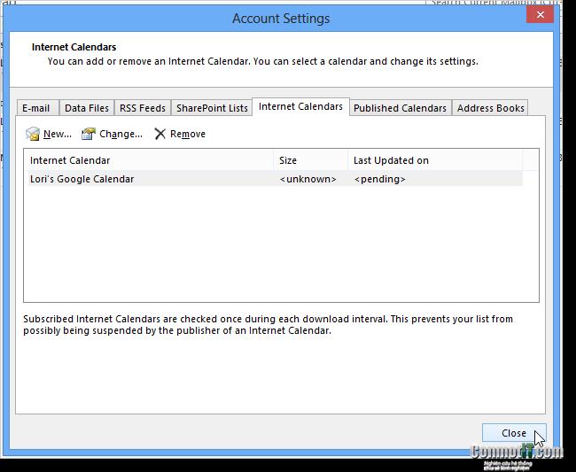 Trong hộp thoại account settings bạn nhấp vào tab internet calendar.