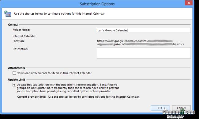 Một hộp thoại subscription options xuất hiện. Bạn đặt tiêu đề cho lịch trong phần folder name. Sau đó bấm OK.