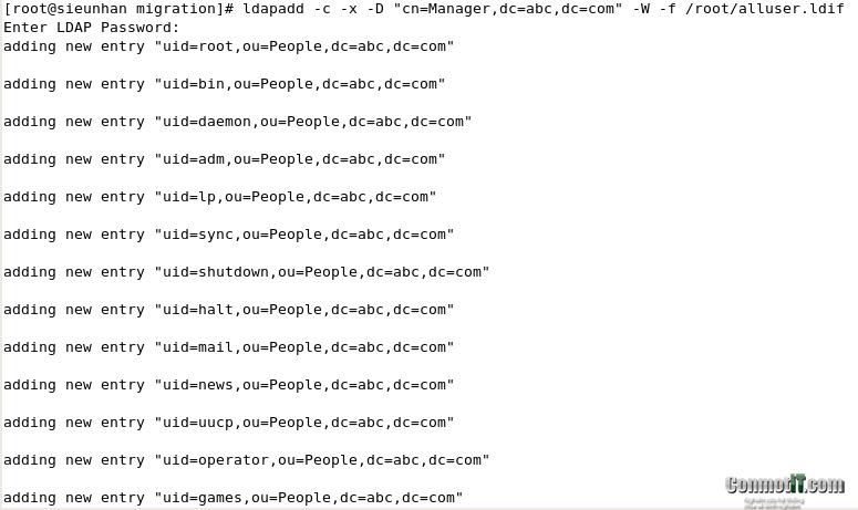 ldapadd -c -x -D "cn=Manager,dc=abc,dc=com" -W -f /root/alluser.ldif